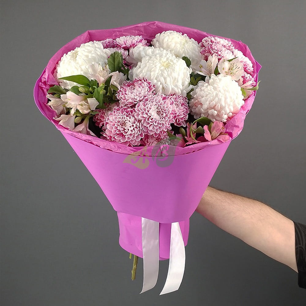 Шикарный букет – это сочетание альстромерии и восхитительных хризантем в одной композиции. Эти цветы можно заказать для модницы, ведь он довольно необычен.